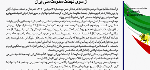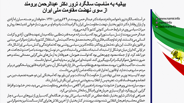 از سوی نهضت مقاومت ملی ایران در آستانه سالگرد ترور ناجوانمردانه زندهیاد دکتر عبدالرحمن برومند در 29 فروردین 1370، حقوقدان برجسته، مبارز راه آزادی و از یاران وفادار دکتر شاپور بختیار، نهضت مقاومت ملی...