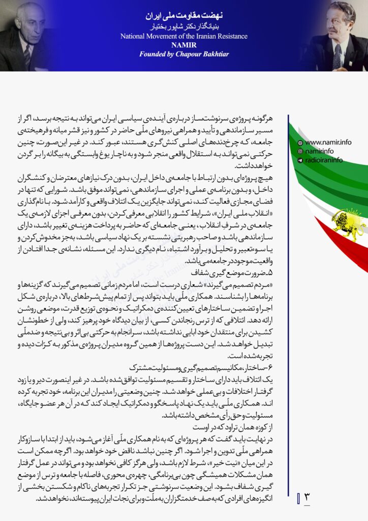 هرگونه پروژهی سرنوشتساز دربارهی آیندهی سیاسی ایران میتواند به نتیجه برسد، اگر از مسیر سازماندهی و تأیید و همراهی نیروهای ملّی حاضر در کشور و نیز قشر میانه و فرهیختهی جامعه، که چرخدندههای اصلی کنشگری هستند، عبور کند. در غیر اینصورت، چنین حرکتی نمیتواند به استقلال واقعی منجر شود و به ناچار یوغ وابستگی به بیگانه را بر گردن خواهد داشت.