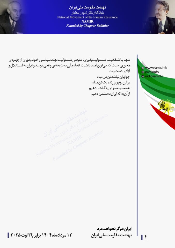 تنها با شفافیت، مسئولیتپذیری، معرفی مسئولیت نهاد سیاسی خود و دوری از چهرهی محوری است که میتوان امید داشت اتحاد ملّی به نتیجهای واقعی برسد و ایران به استقلال و آزادی دست یابد.