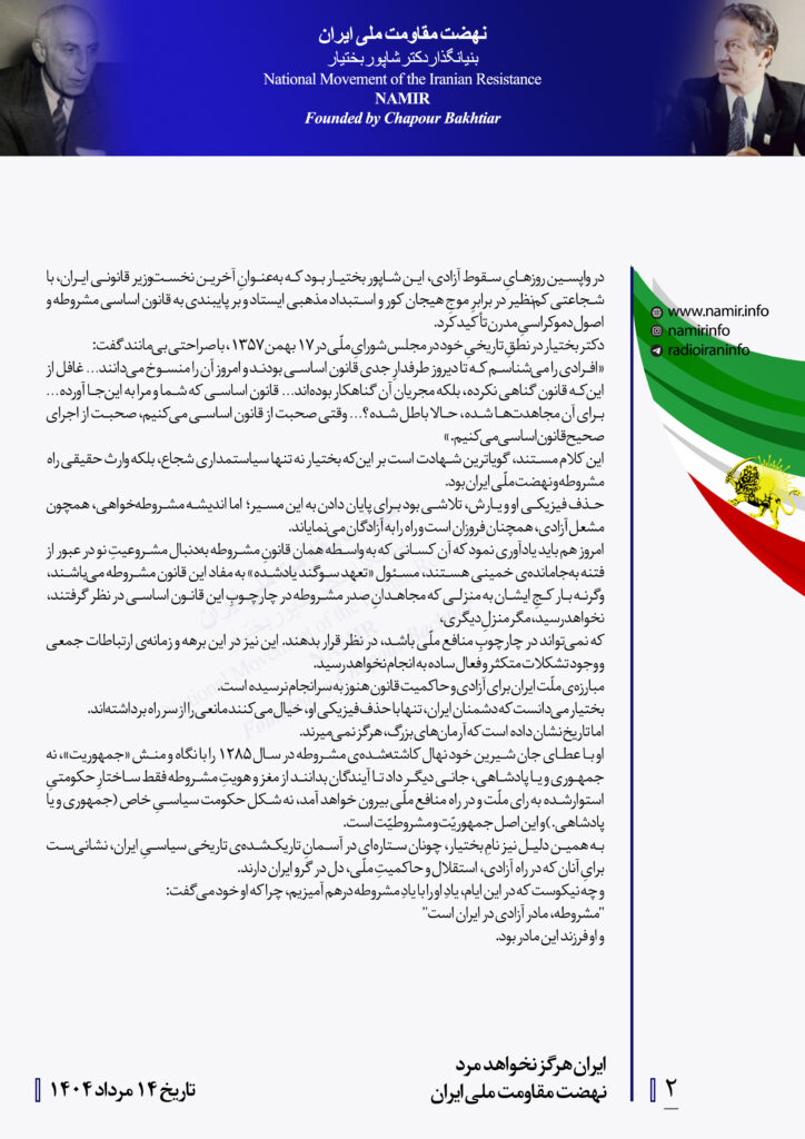 این همزمانیِ شگفت، تصادفی نیست؛ بلکه حکایت از آن دارد که راهِ مشروطه، راه نیمهتمامِ آزادی ایران است، و بختیار، آخرین پرچمدار این راه.